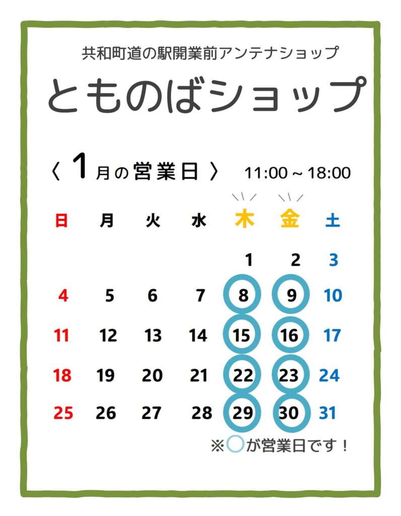 1月のとものばショップの営業日は毎週木・金曜日の11時~18時となっております。年始は8日からの営業です。