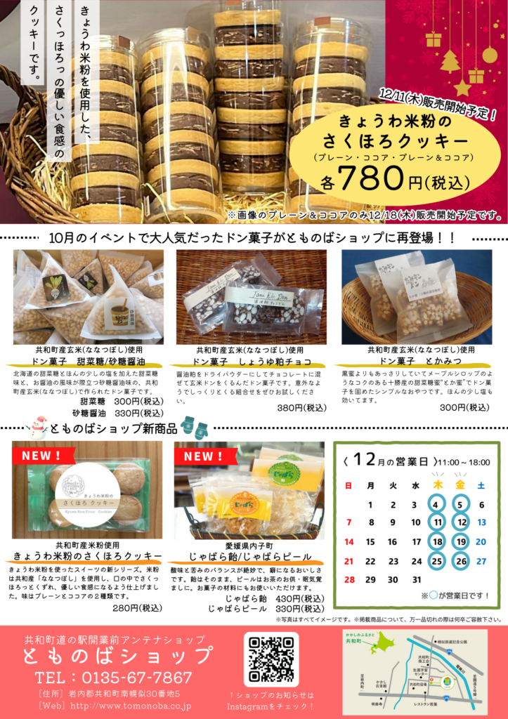 10月のイベントで大人気だった共和町産玄米(ななつぼし)を使ったポン菓子(甜菜糖・砂糖醤油・とかみつ・チョコ)4種類と、12/12(木)からは口の中でさくっほろっとくずれ優しい食感になるように仕上げた、きょうわ米粉を使ったスイーツの新シリーズ「きょうわ米粉のさくほろクッキー」を新しく販売いたします🌾