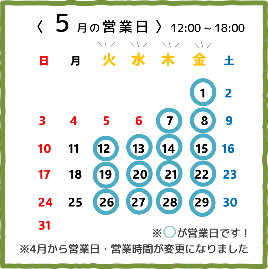 5月のとものばショップの営業日は毎週火曜、水曜、木曜、金曜日の12時~18時!GW期間中の祝日はお休みをいただきますのであらかじめご了承ください。