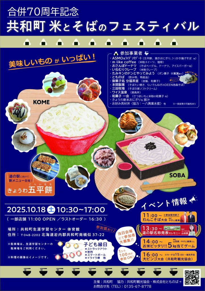 共和町合併70周年を記念して、共和町 生涯学習センター 体育館にて、10月18日(土) 共和の新米と新そばが食べられるイベントを開催いたします。
