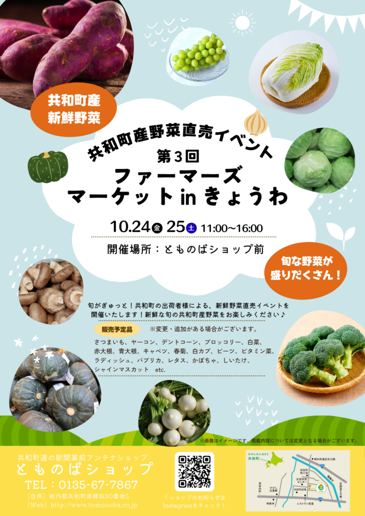 旬がぎゅっと!共和町の出荷者様による、新鮮野菜直売イベントを開催いたします!新鮮な旬の共和町産野菜をお楽しみください♪